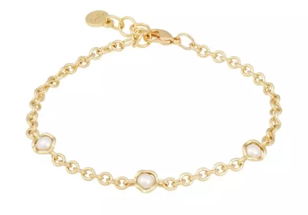 Armlenke i gullbelagt metall fra Snö of Sweden. Tre hvite glassperler i organisk fattekant, fast på lenken. Lengde 16 + 2cm.