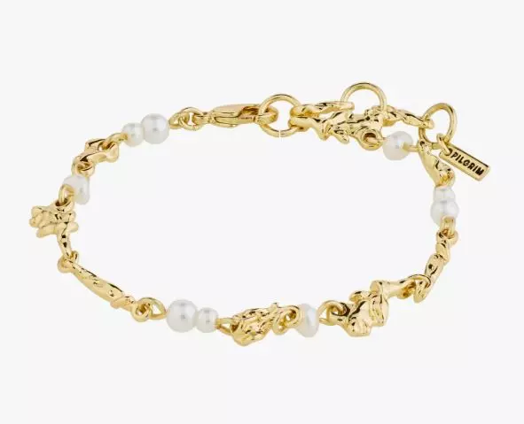 Armlenke i gullbelagt metall fra danske Pilgrim. Boho-stil med en mix av forgylte nuggets, ferskvannsperler og glassperler. Lengde 17 + 3cm.