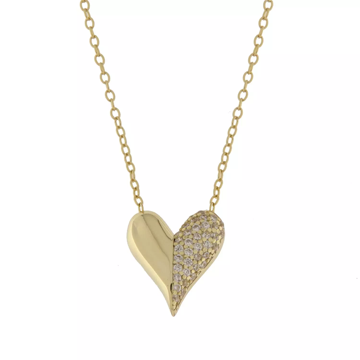 Halssmykke i forgylt sølv. 12mm hjerte med blanke cubik zirconer på ene siden. På tynt ankerkjede i forgylt sølv, lengde 42 + 5cm.