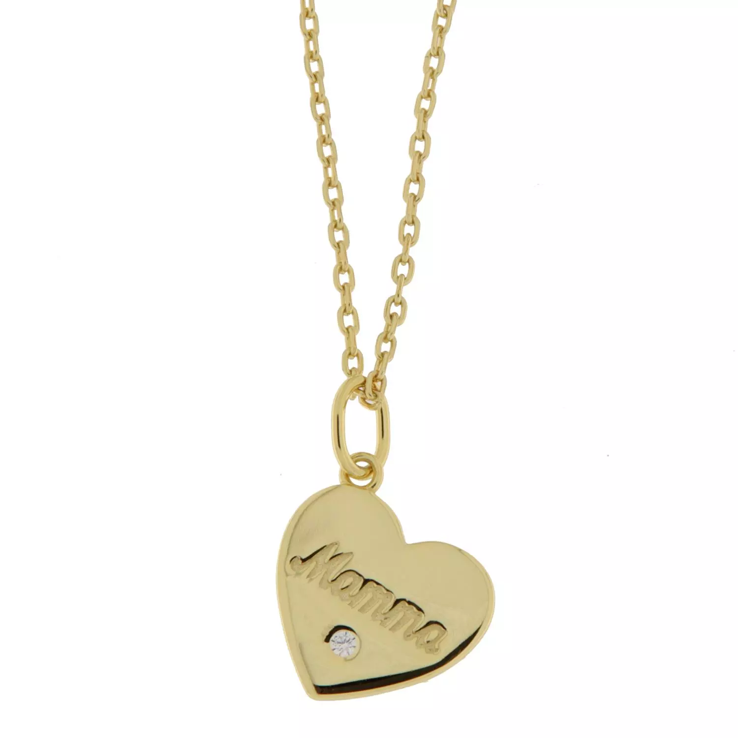 Halssmykke i forgylt sølv. 12mm hjerteformet plate med «Mamma» inngravert, og en liten blank cubik zircon under. På tynt ankerkjede i forgylt sølv, lengde 42 + 5cm.