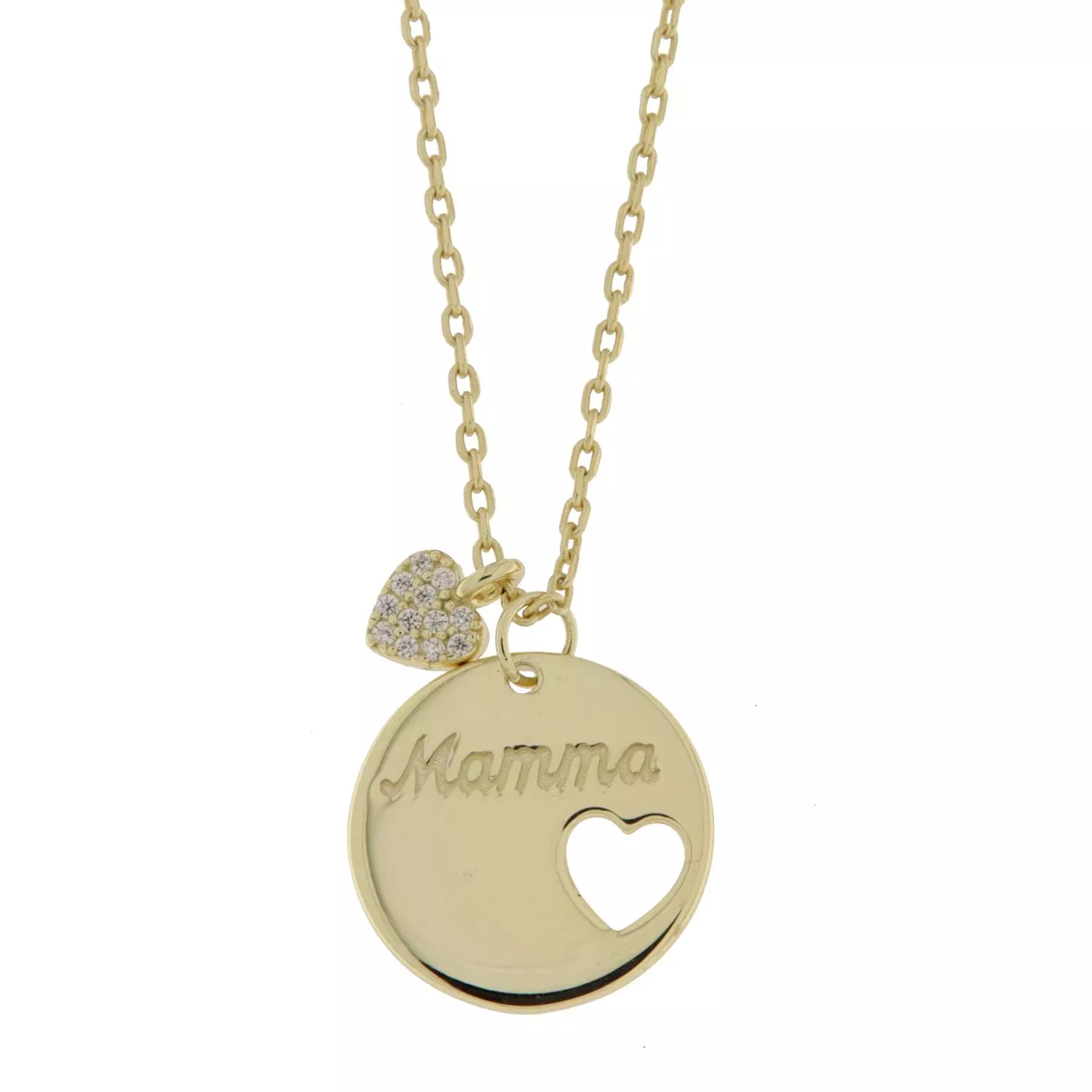 Halssmykke i forgylt sølv. 15mm plate med «Mamma» inngravert, og et utskjært hjerte. 5mm hjerte med blanke cubik zirconer hengende på siden. På tynt ankerkjede i forgylt sølv, lengde 42 + 5cm.