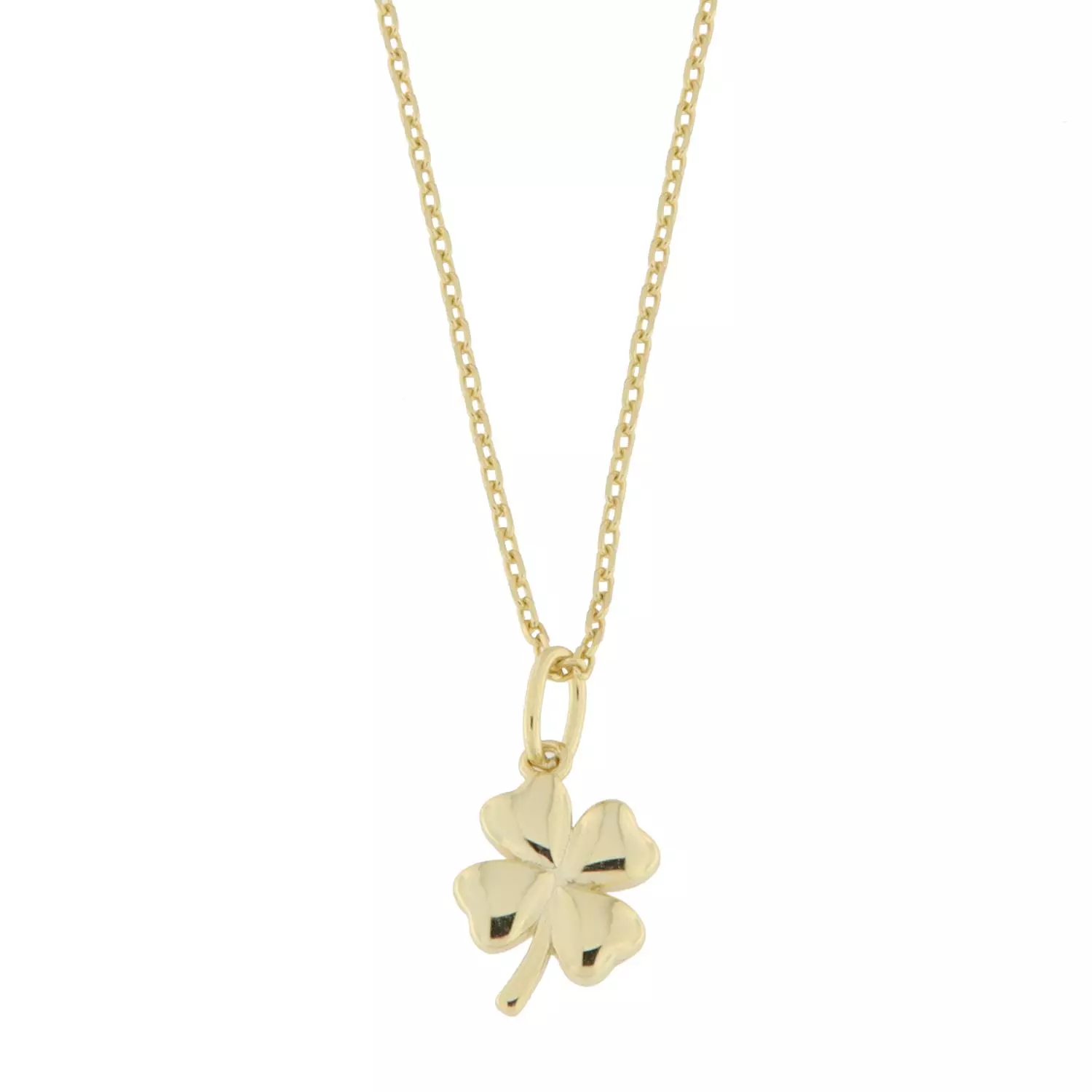 Halssmykke i forgylt sølv. 9mm glatt firkløver. På tynt ankerkjede i forgylt sølv, lengde 42 + 5cm.