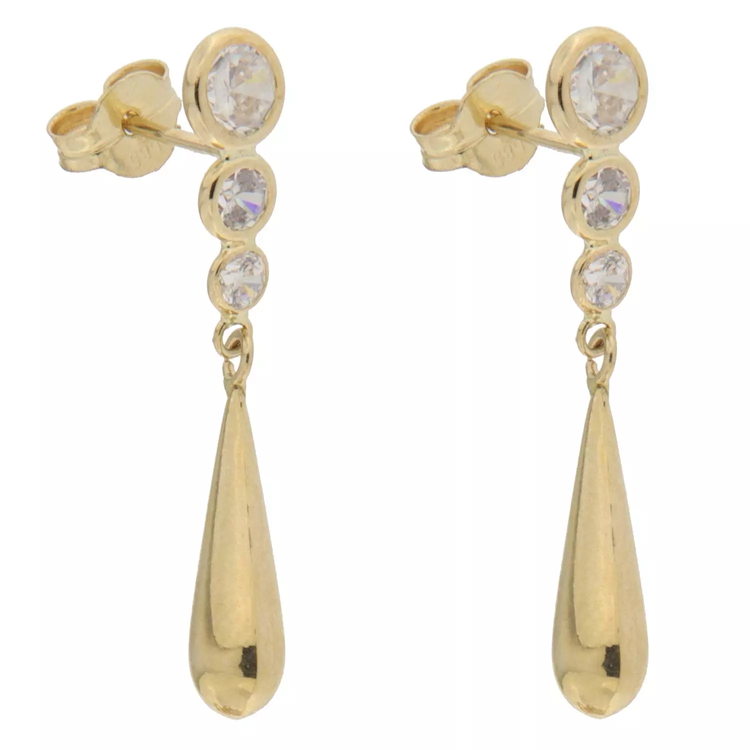 Øreheng i 585 / 14 karat gult gull. Tre blanke cubik zirconer i toppen (4, 3, 2mm) med en 12mm glatt dråpe i heng under.